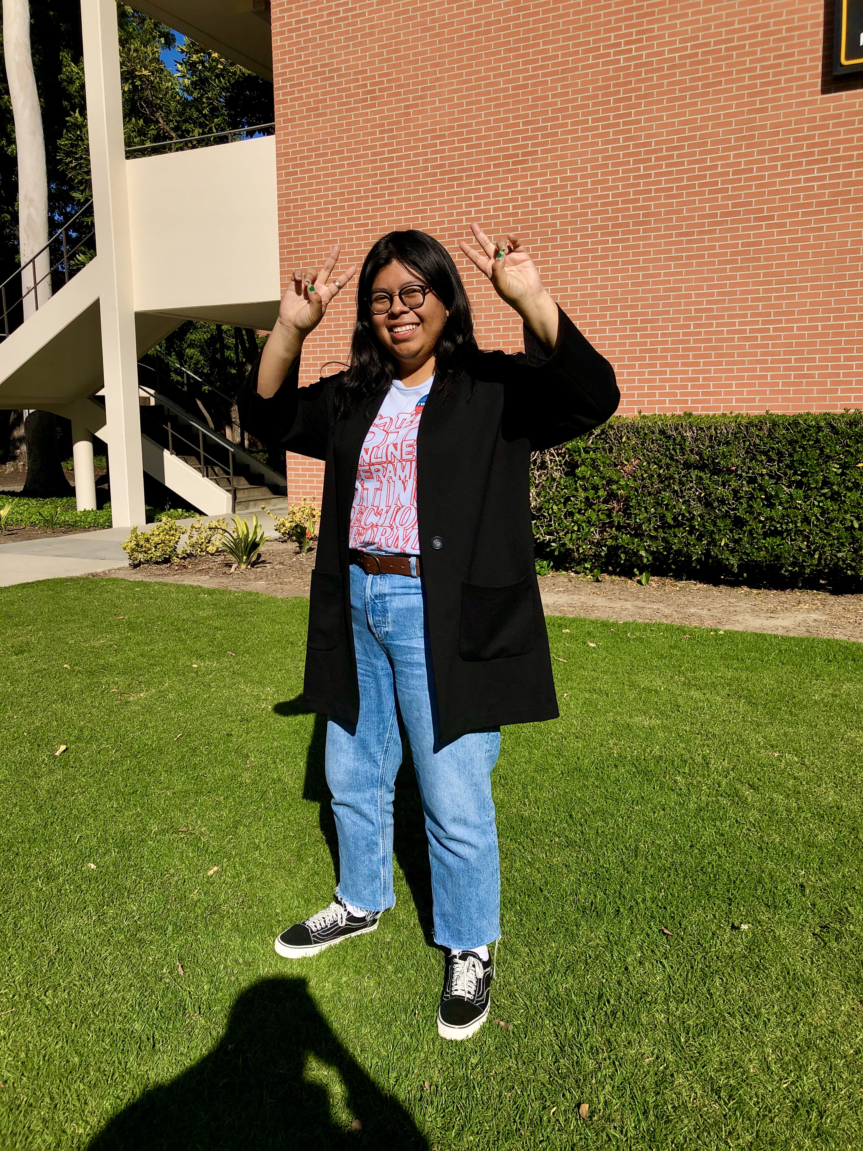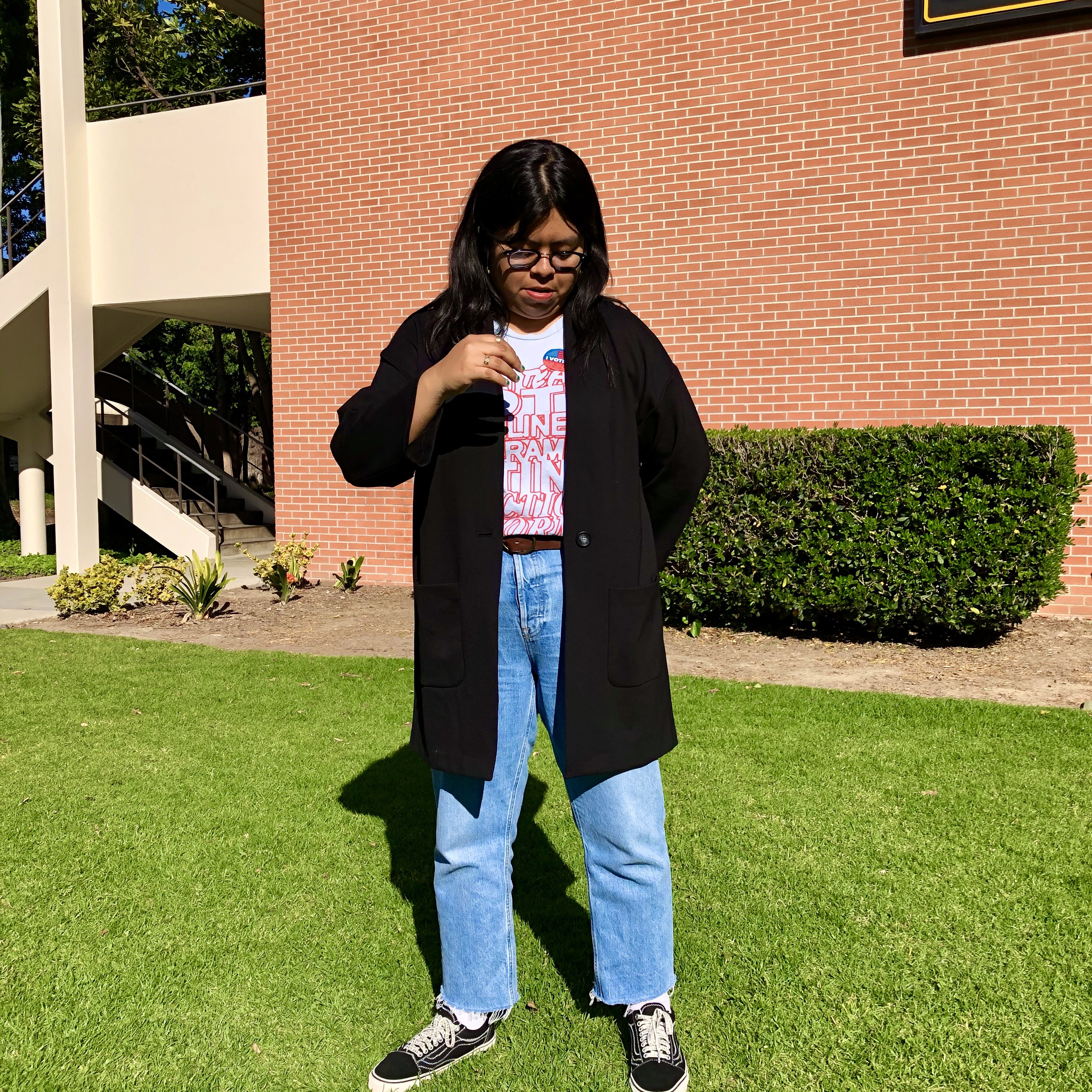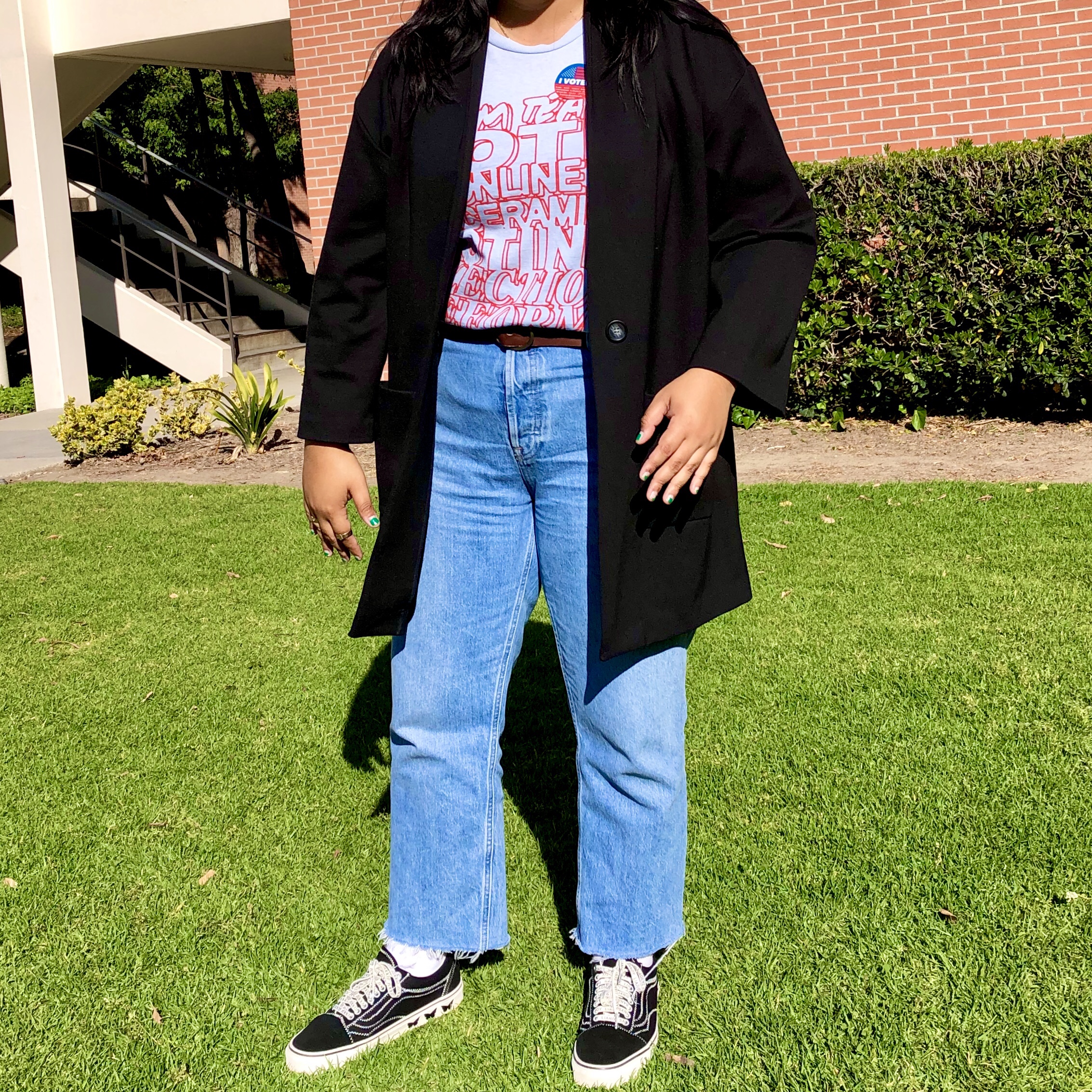 I tried to dress like a cool professor on voting day. I french tucked my t-shirt with a message, wore a coat, and let my hair down. I usually wear tshirts and pants when I go to school so this was leveling up my outfit. This coat makes me feel really important. It’s like I had somewhere to be at all times.